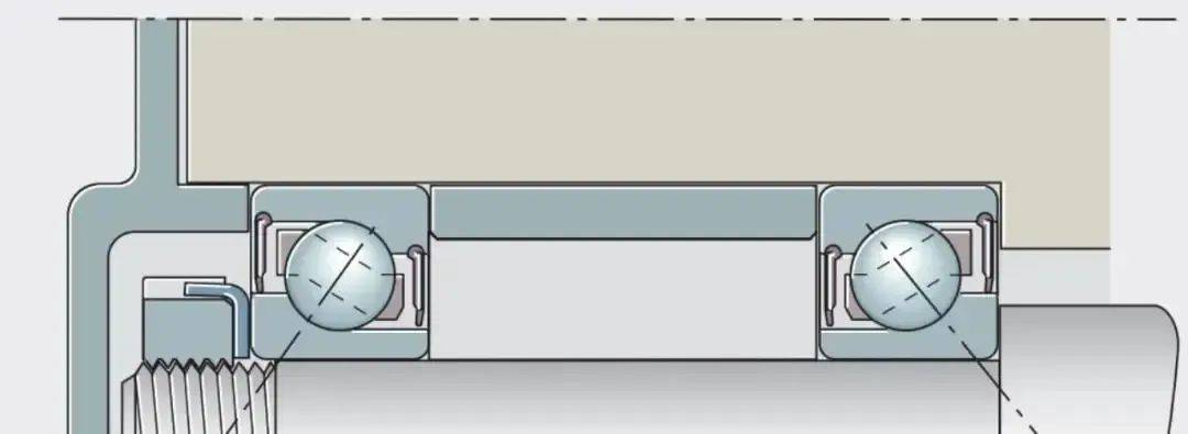 图中,两个背对背安装的角接触球轴承位于轴的两端,通过隔圈隔开。此时,轴承的内部游隙(或预紧力)由隔圈的长度控制:隔圈越长,预紧力越大;反之"则越小。