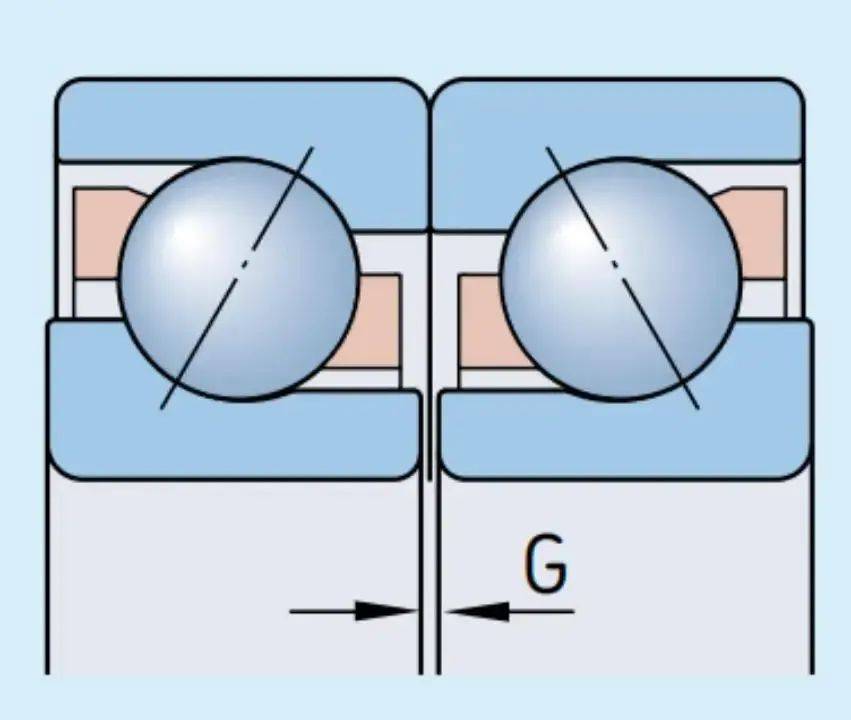 观察背对背安装的配对轴承(见上图):角接触球轴承在零游隙状态下,其端面(厚边与薄边)可能不在同一平面上。图示情况即为轴承厚边高于薄边。当两个轴承的厚边被压紧时,其薄边之"间会存在间隙。若施加外力将薄边也压紧,轴承内部便产生负游隙,即形成预紧力。